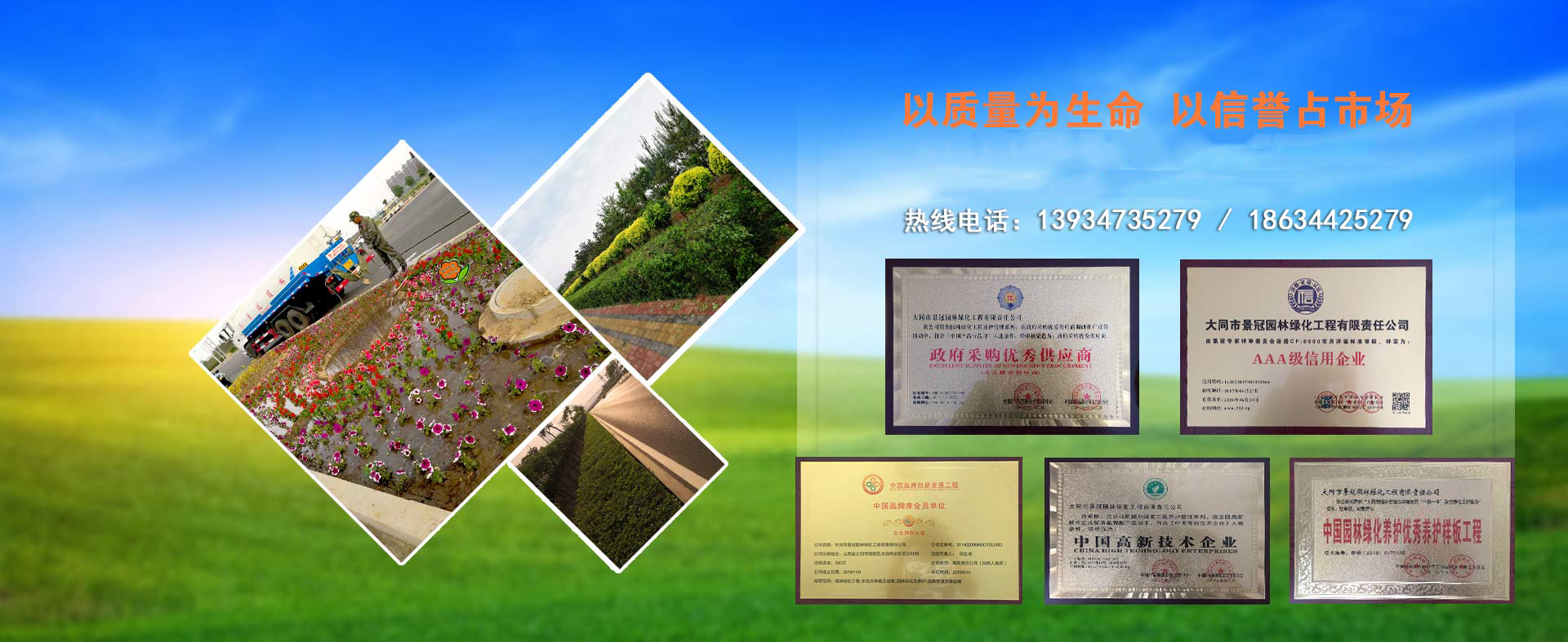 大同市景冠園林綠化工程有限責(zé)任公司是一家根植于設(shè)計、施工、植保養(yǎng)護、苗木花卉生產(chǎn)于一體的園林景觀企業(yè)。公司“以質(zhì)量為生命”、“以信譽求發(fā)展”這是公司一貫的經(jīng)營宗旨。并以創(chuàng)新,誠信,綠色,共享的發(fā)展理念,創(chuàng)造良好的企業(yè)環(huán)境。堅持愛綠,護綠,保綠的方針為城市增添一份綠色,用綠色擔(dān)當(dāng)生態(tài)建設(shè)使命是我們共同追求的價值和企業(yè)目標(biāo)。以全新的管理模式,完善的技術(shù),周到的服務(wù),卓越的品質(zhì)為生存根本。幾年來我們致力于園林景觀植物領(lǐng)域的研究,在城市綜合體景觀,校園園林景觀,道路景觀,生態(tài)農(nóng)業(yè)景觀,美麗鄉(xiāng)村景觀,濕地景觀等多個領(lǐng)域參與規(guī)劃設(shè)計施工。不斷加大科技投入力度,加強人才的儲備,網(wǎng)絡(luò)技術(shù)的培訓(xùn),提升自主創(chuàng)新能力,不斷完善企業(yè)文化,用超前的技術(shù)制定出一套完整的園林植保技術(shù)管理方案。我們堅持以擔(dān)當(dāng)為使命,用戶至上,服務(wù)至上,秉持初衷,不忘初心,實實在在,心無旁騖做好植保養(yǎng)護主業(yè),打造屬于自己的企業(yè)品牌,好好服務(wù)客戶,打動客戶。